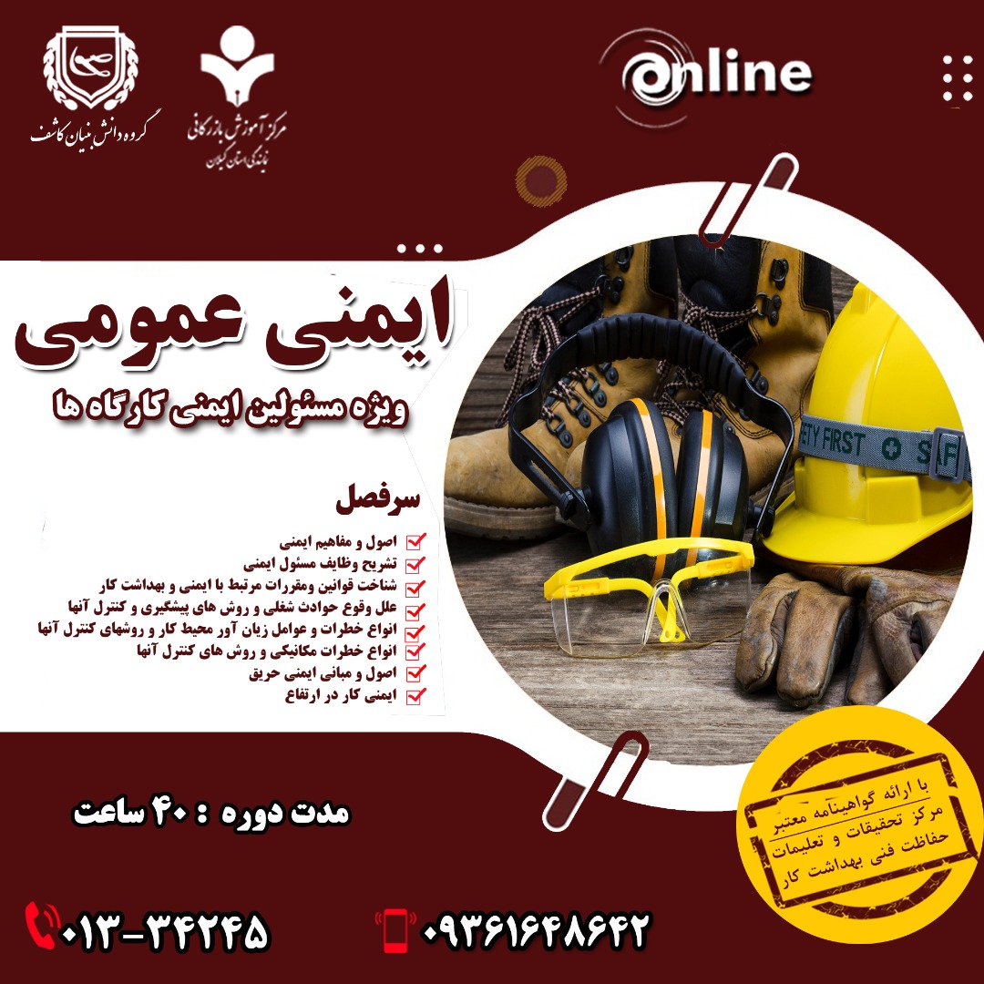 دوره های آموزشی ایمنی عمومی ویژه مسئولین ایمنی کارگاهها، ایمنی عمومی ویژه کارگران و شناسایی خطرات و ارزیابی ریسک، توسط گروه دانش بنیان کاشف و مرکز آموزش بازرگانی گیلان برگزار می گردد.